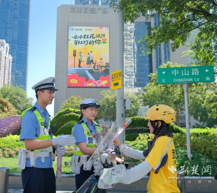 圖為:江蘇省無錫市中山路附近,兩位城市交警現(xiàn)場為騎手送小紅花,倡導安全出行。