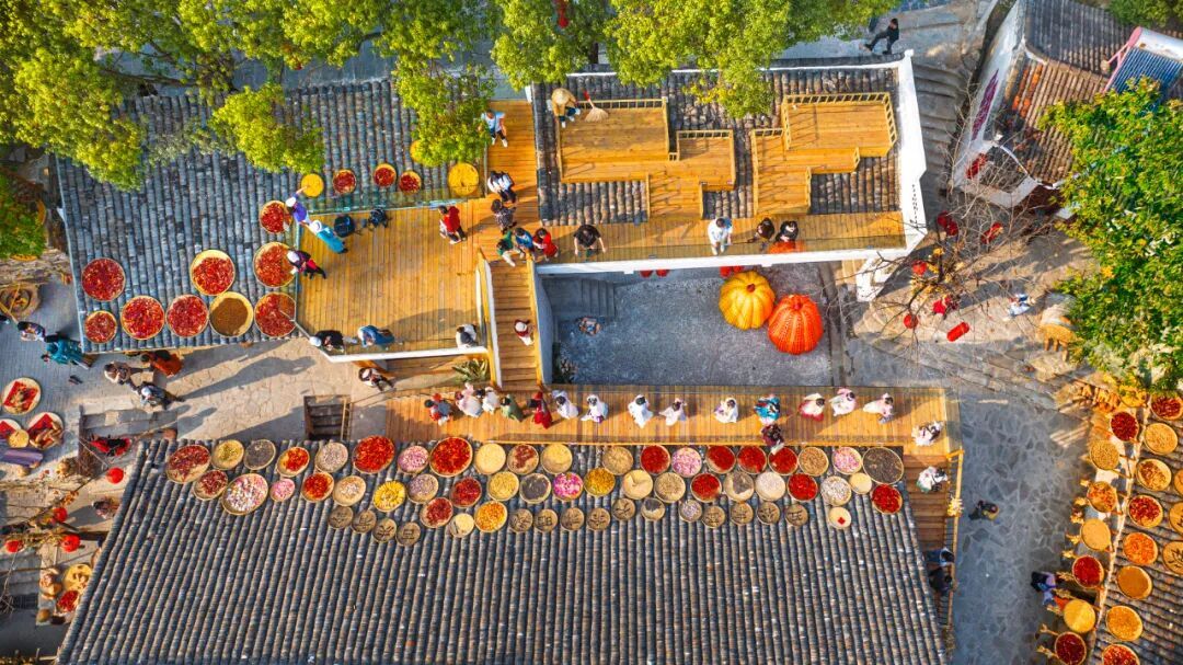在大余灣,曬秋是鐫刻在石墻黛瓦間的詩意。簸箕托起整個(gè)秋天的饋贈(zèng)——火紅的辣椒、金黃的玉米、橙黃的南瓜、褐色的板栗……層層疊疊鋪展在檐下、院中、屋頂,與明清時(shí)期的古建筑交相輝映,潑灑出中國最生動(dòng)的秋日油畫。