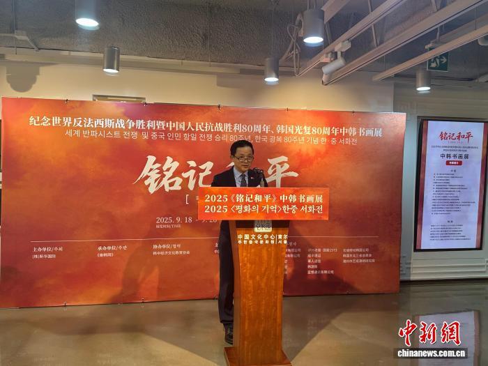9月18日,《銘記和平——紀念世界反法西斯戰(zhàn)爭暨中國人民抗戰(zhàn)勝利80周年、韓國光復80周年中韓書畫展》在首爾中國文化中心開幕。圖為中國駐韓國大使戴兵致辭。姜春雨 攝