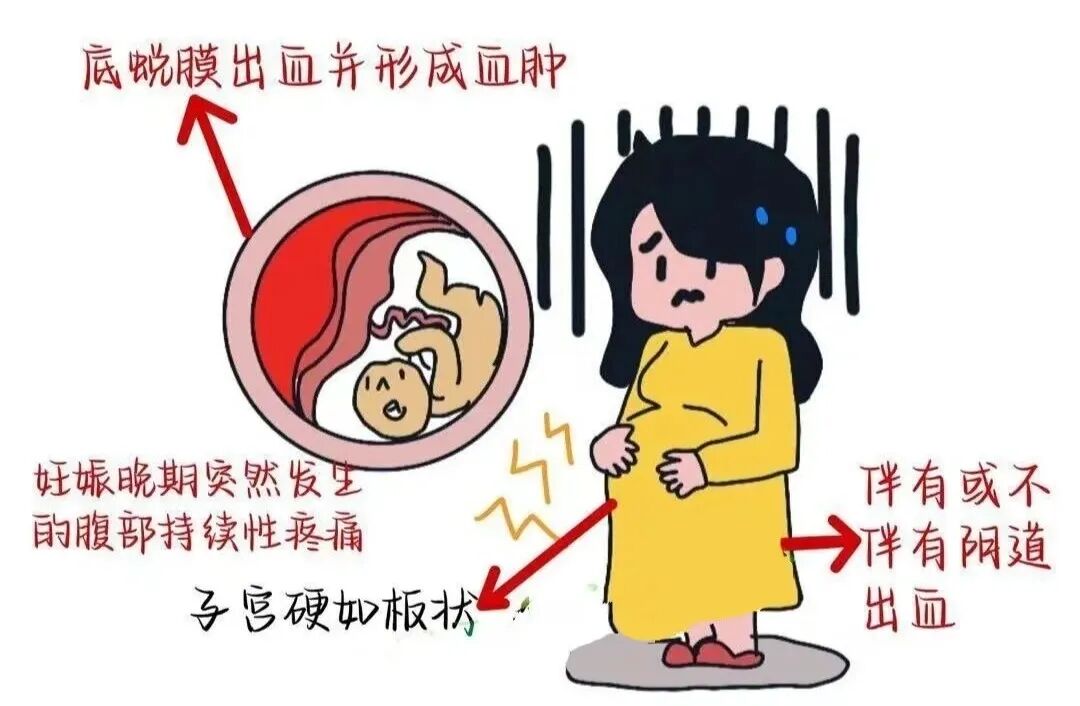 典型癥狀:妊娠晚期突發(fā)持續(xù)性腹痛,伴或不伴陰道流血,疼痛程度與剝離面積、內出血量成正比,剝離面積越大、內出血越多,腹痛越劇烈。