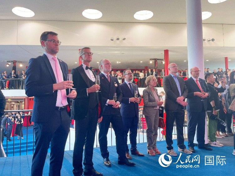 人民網(wǎng)杜伊斯堡9月19日電 (記者劉赫)當(dāng)?shù)貢r(shí)間19日,中國(guó)駐杜塞爾多夫總領(lǐng)館在杜伊斯堡瑪麗安門劇院舉行國(guó)慶招待會(huì),慶祝中華人民共和國(guó)成立76周年,并歡迎總領(lǐng)事余勇履新。北威州第一副議長(zhǎng)施梅爾策、杜伊斯堡市長(zhǎng)林克、北威州經(jīng)濟(jì)部外貿(mào)司司長(zhǎng)特勞佩爾、諾伊斯行政區(qū)長(zhǎng)官、杜塞爾多夫第一副市長(zhǎng)等州市代表以及來自北威州政界、經(jīng)濟(jì)界、教育界和文化界的友好人士,僑團(tuán)代表、華僑華人、中資企業(yè)和留學(xué)生代表等300余人出席。