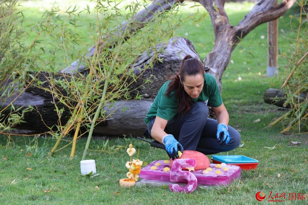 圖為飼養(yǎng)員為大熊貓準備特制的生日蛋糕。人民網(wǎng)記者 許海林攝