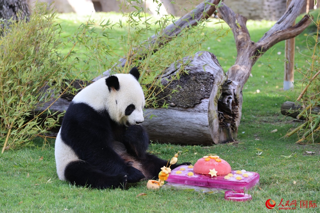 圖為大熊貓享用自己的“生日大餐”。人民網(wǎng)記者 許海林攝