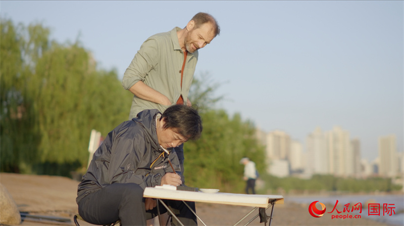 意大利藝術(shù)家馬泰奧與中國(guó)藝術(shù)家陳明坤在黃河之濱共創(chuàng)。人民網(wǎng) 嚴(yán)小晶攝