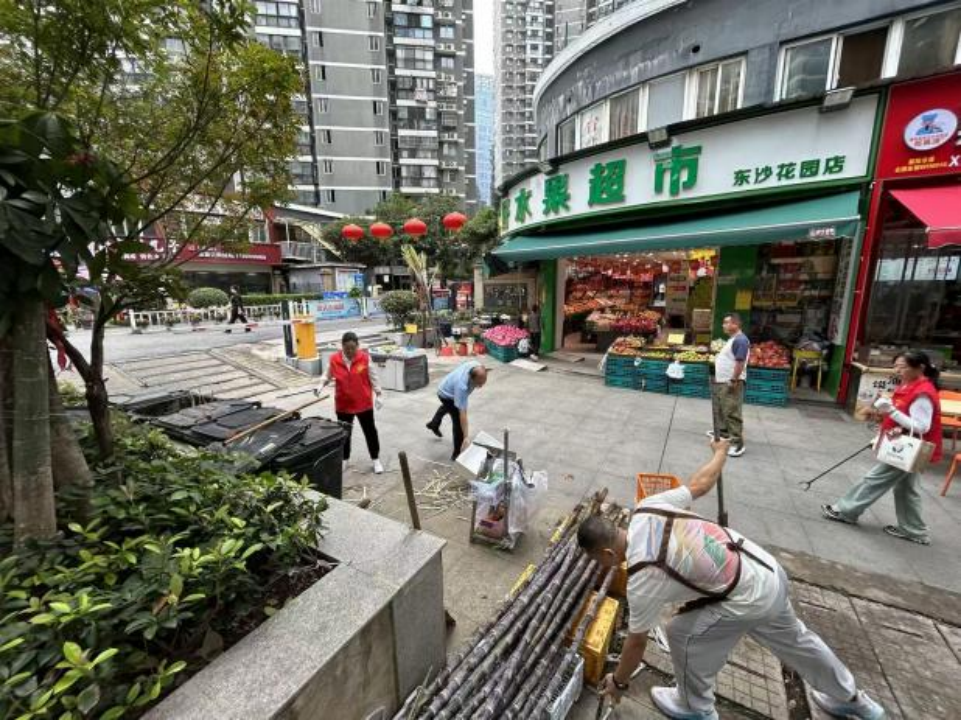 上午九點(diǎn),東沙商業(yè)街區(qū)一派熱火朝天的勞動(dòng)景象。行動(dòng)中,各方分工明確、協(xié)同發(fā)力,形成“多元共治”的生動(dòng)畫(huà)面。街道公管辦與綜合執(zhí)法中心統(tǒng)籌指揮,重點(diǎn)清運(yùn)街角巷尾積存雜物和大件垃圾;社區(qū)工作人員和志愿者深入綠化帶,細(xì)致?lián)焓盁燁^、紙屑,全面擦洗公告欄、垃圾箱等“城市家具”,有效解決容器漫溢、綠化帶藏污等問(wèn)題。多家商戶(hù)也紛紛主動(dòng)加入,拿起掃帚、水桶,清洗門(mén)前路面、擦拭櫥窗、規(guī)范物品擺放,從“各掃門(mén)前雪”轉(zhuǎn)變?yōu)椤肮沧o(hù)大家園”。