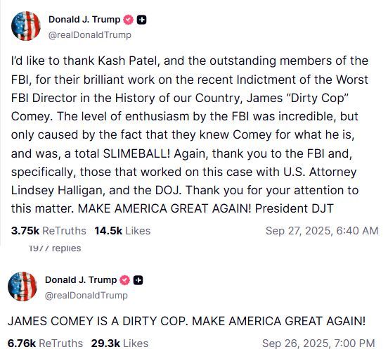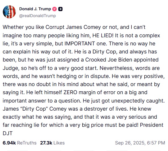 十幾個(gè)小時(shí)后,也許依然意難平,特朗普又發(fā)一篇長(zhǎng)帖文,把科米形容為“骯臟警察”,“他曾經(jīng)是、如今還是個(gè)徹頭徹尾的卑鄙小人”。特朗普同時(shí)對(duì)現(xiàn)任聯(lián)邦調(diào)查局局長(zhǎng)帕特爾的工作表示肯定,并對(duì)負(fù)責(zé)處理本案的相關(guān)人員表達(dá)感謝。
