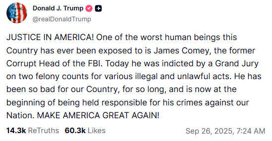 科米被起訴消息公布后,特朗普立即在社交媒體上表示“慶?!?,稱科米“長(zhǎng)期以來對(duì)美國(guó)非常壞”,現(xiàn)在“正義終于得到伸張”。就在數(shù)天前,特朗普還在社交媒體上發(fā)帖,抱怨司法部對(duì)科米的調(diào)查遲遲沒有下文,要求盡快對(duì)科米提起訴訟。
