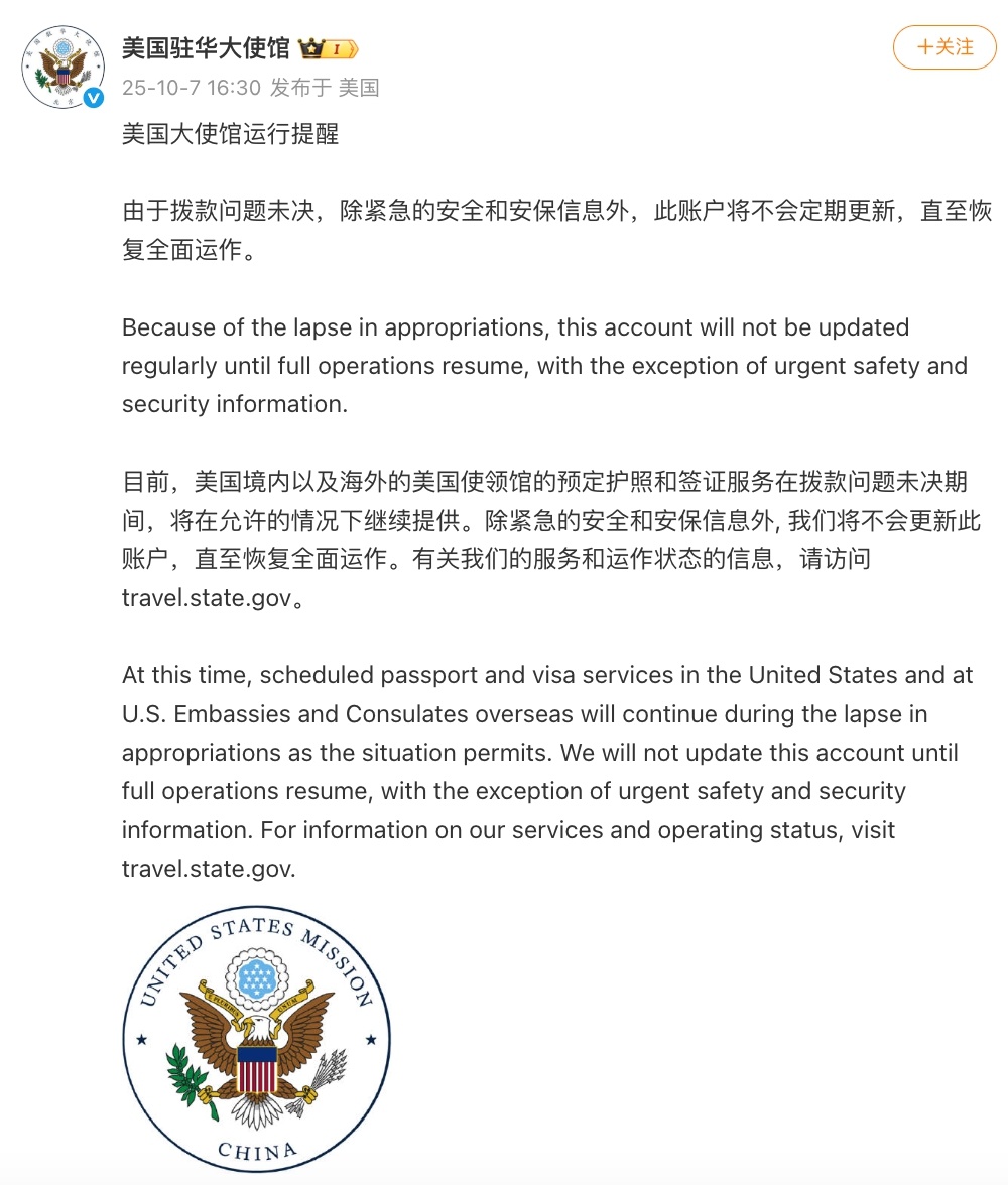 據(jù)環(huán)球時報此前報道,北京時間10月3日下午1時23分,美國駐華使領(lǐng)館在美國社交平臺X上的官方賬號上宣布,由于撥款問題未解決,除緊急的安全和安保信息外,此賬戶將不會定期更新,直至恢復全面運作。