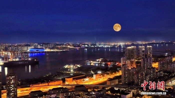 遼寧大連,中秋節(jié)一輪圓月從大連梭魚灣東方海岸線升起。