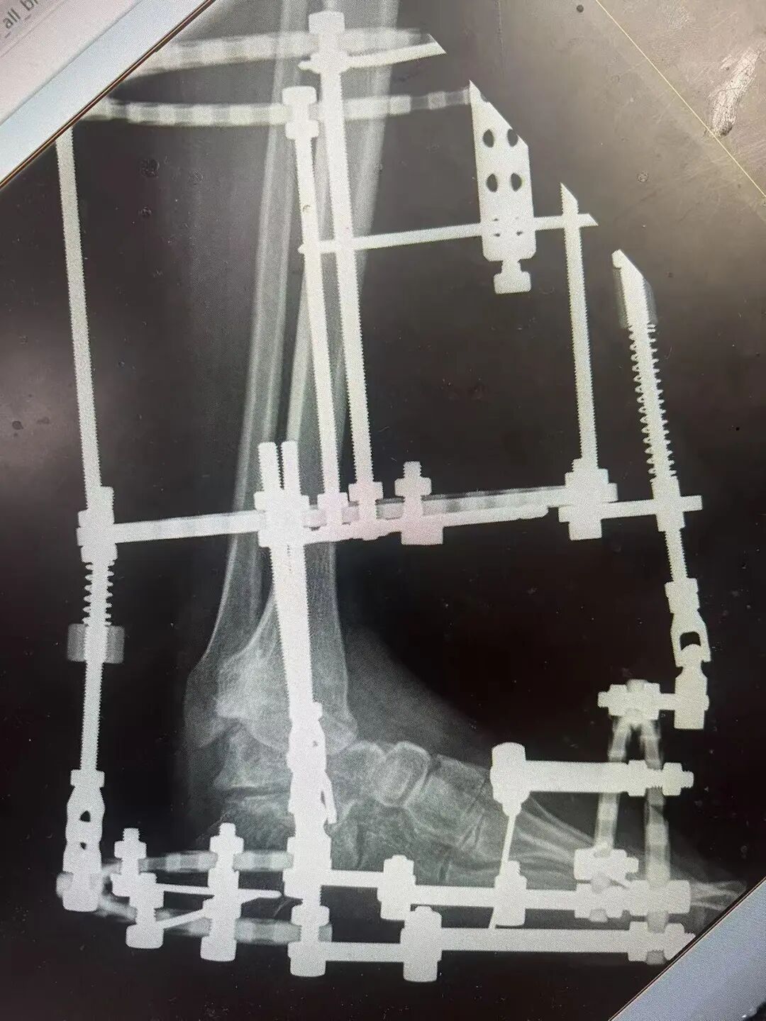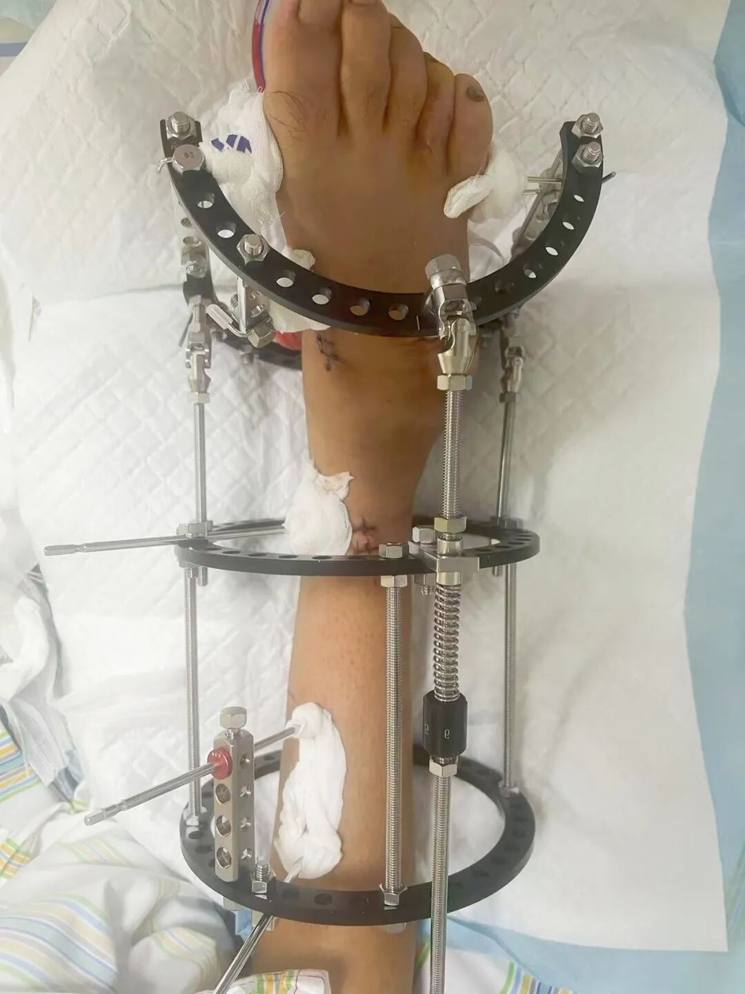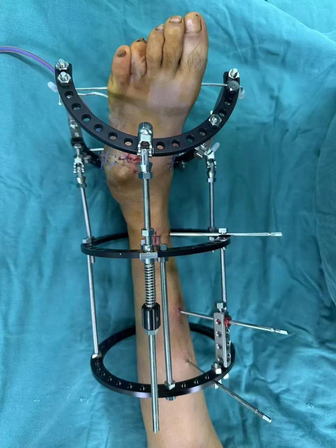 針對(duì)陽先生的復(fù)雜情況,鄭群龍醫(yī)師團(tuán)隊(duì)制定了詳盡的手術(shù)方案:左踝關(guān)節(jié)融合+馬蹄足畸形矯正+跟腱延長+外固定架固定術(shù)。手術(shù)的核心,正是伊里扎洛夫技術(shù)。這項(xiàng)技術(shù)如同精密的“時(shí)空建筑學(xué)”,通過微創(chuàng)安裝環(huán)形外固定架,前足-后足安裝鋼環(huán),再將足的鋼環(huán)與脛骨的固定鋼環(huán)在踝關(guān)節(jié)前、后、左、右用帶關(guān)節(jié)的螺紋桿連接,由此構(gòu)建成一個(gè)能體外牽拉調(diào)控的三維立體構(gòu)型,在術(shù)后進(jìn)行精準(zhǔn)、緩慢的調(diào)整,一寸一寸逐步將畸形的骨骼、軟組織恢復(fù)到正常位置。