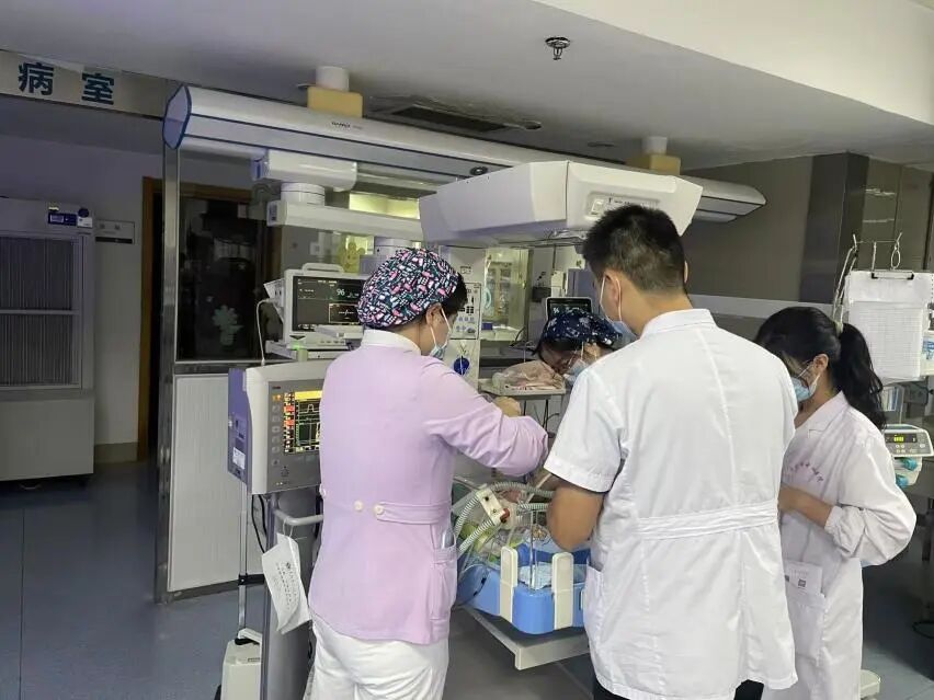 與此同時(shí),在救護(hù)車返回本院前,新生兒科病房已做好全面準(zhǔn)備:呼吸機(jī)、復(fù)蘇設(shè)備、嬰兒輻射保暖臺(tái)及B超設(shè)備等一應(yīng)俱全?;純阂唤?jīng)送達(dá),便通過(guò)綠色通道直接接入新生兒重癥監(jiān)護(hù)室(NICU),醫(yī)療團(tuán)隊(duì)迅速展開(kāi)一系列搶救措施:機(jī)械通氣、補(bǔ)液、抗感染治療,并完成床邊X光、肺臟彩超、顱腦及心臟彩超等周密檢查。團(tuán)隊(duì)依據(jù)檢查結(jié)果精準(zhǔn)制定治療方案,細(xì)致落實(shí)護(hù)理措施,為危重新生兒提供全方位、高水平的醫(yī)療支持。