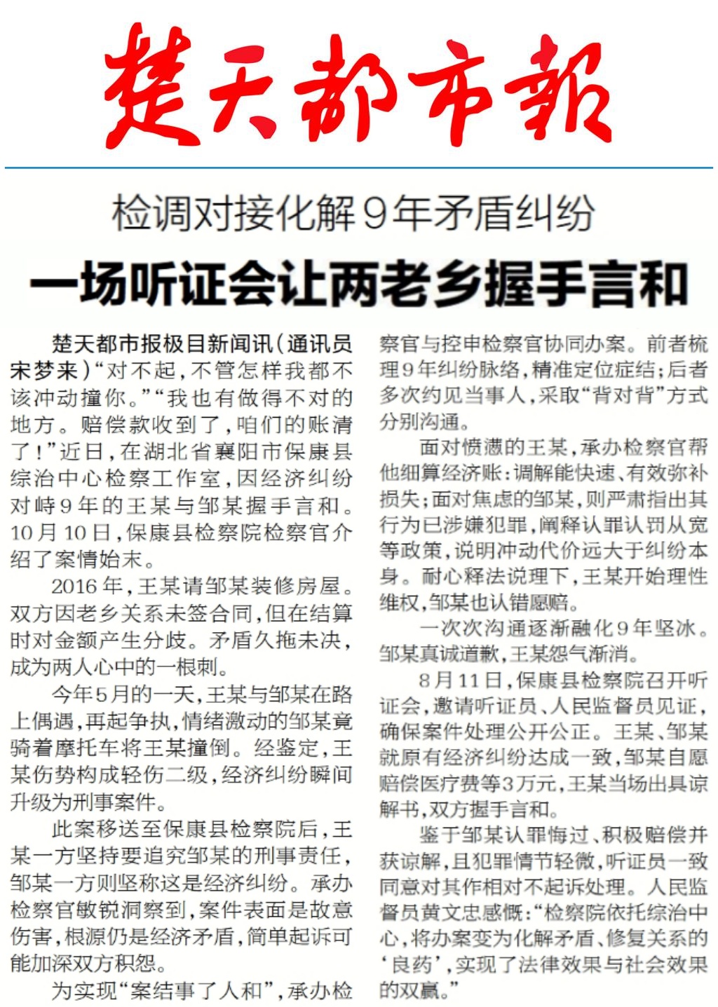 8月11日,??悼h檢察院召開聽證會,邀請聽證員、人民監(jiān)督員見證,確保案件處理公開公正。王某、鄒某就原有經(jīng)濟糾紛達成一致,鄒某自愿賠償醫(yī)療費等3萬元,王某當場出具諒解書,雙方握手言和。