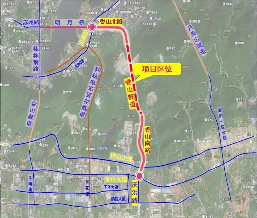 項(xiàng)目北起沿湖路口,與明月橋延伸線順接,穿越黃荊山后,南至金山大道與慶洪路相接,路線全長(zhǎng)約5.863公里,其中路基段約4公里。