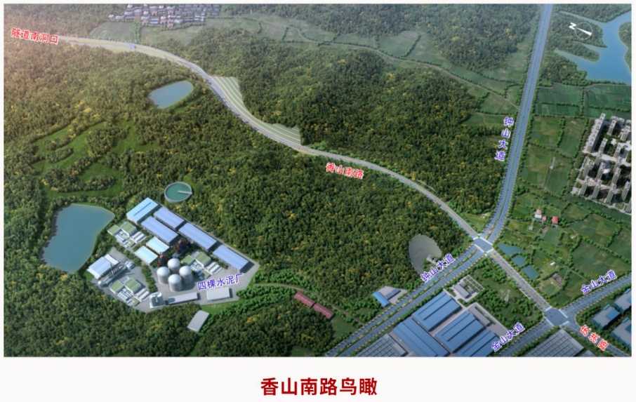 作為配套工程,香山南路同步推進(jìn)。該路段位于開(kāi)發(fā)區(qū)·鐵山區(qū),北接隧道南洞口,途經(jīng)徐祉灣、曾家灣村,與長(zhǎng)龍大道平交后接入金山大道,采用雙向四車(chē)道設(shè)計(jì),路基寬26米。